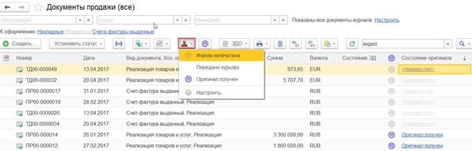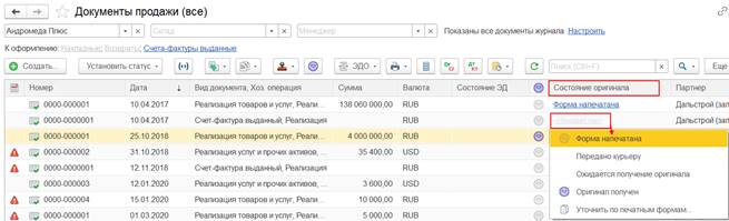 Вести учет наличия оригиналов первичных документов, контролировать состояния оригиналов первичных документов по общему состоянию документа можно в рамках журналов документов (например, в рамках журналов Документы продажи (все), Документы закупки (все)). Для такой возможности в журналы документов добавлены соответствующие инструменты: