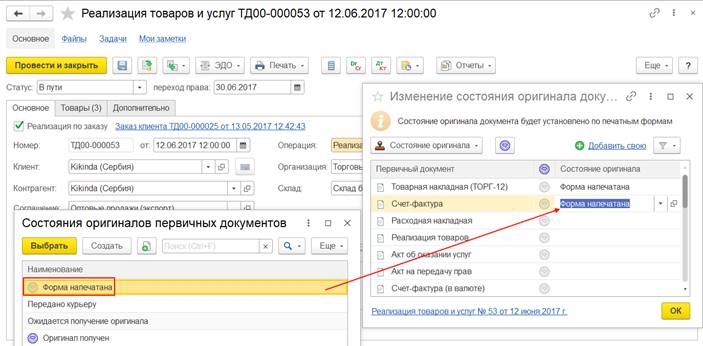 Как только для каждой печатной формы будет установлено состояние Оригинал получен, то документ реализации товаров и услуг примет по умолчанию окончательное состояние Оригинал получен.