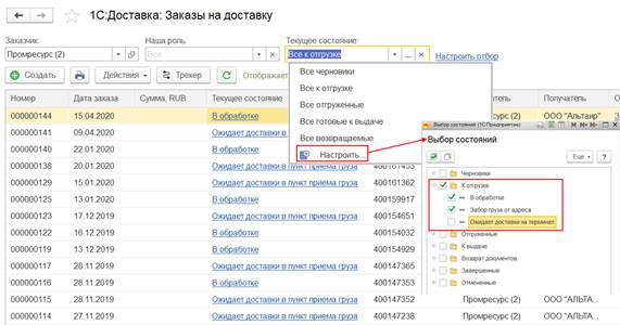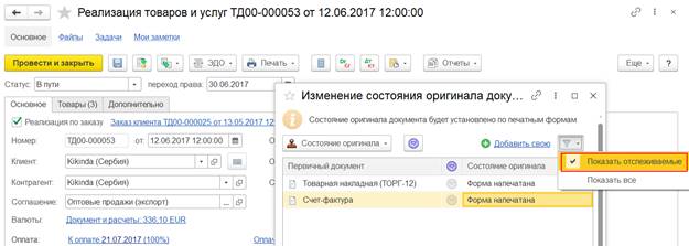 В форме изменения состояния оригинала документа можно установить отбор по отслеживаемым печатным формам (фильтр Показать отслеживаемые).
