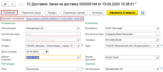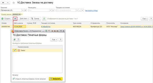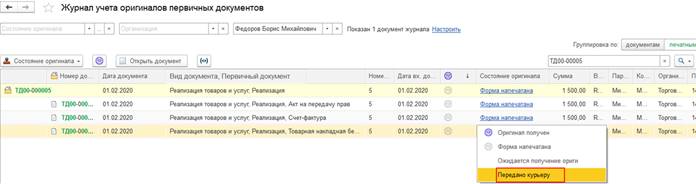 3. Передача оригинала (или печатных форм) первичного документа на подпись клиенту. На данном этапе можно изменить состояние оригинала (или печатных форм) на какое-либо промежуточное состояние. Например, на состояние оригинала Передано курьеру, которое было вручную добавлено в справочник Состояние оригиналов первичных документов.