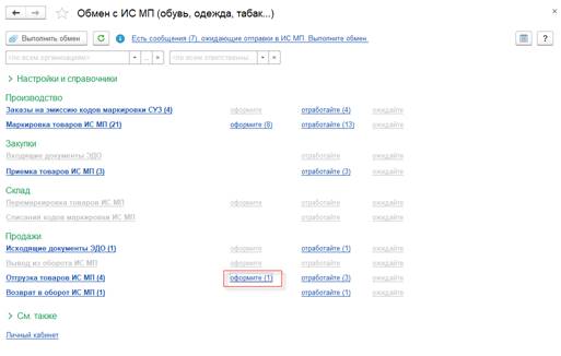 Форма Обмен с ИС МП (обувь, одежда, табак..) является единым рабочим местом, из которого можно выполнять настройки обмена с ИС МП оформлять и контролировать все операции по всем категориям маркируемой продукцией.