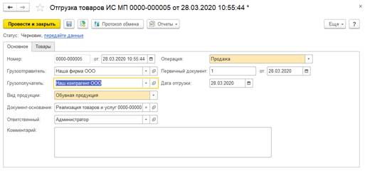 На закладе Основное созданного документа Отгрузка товаров ИС МП среди прочего указывается вид продукции и вид операции.