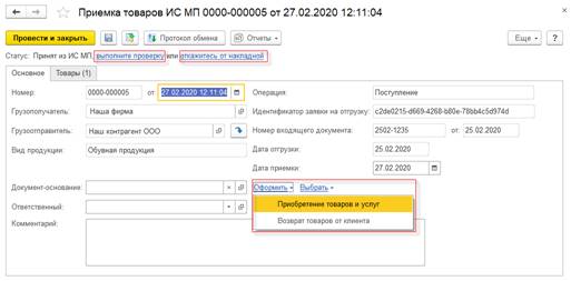 По поступившему документу необходимо выполнить проверку поступившей продукции (ссылка выполните проверку) и подтвердить поступление или отказаться от накладной. Проверка поступивших товаров выполняется в форме Проверка и подбор маркируемой продукции (ссылка Проверить маркированную продукцию на закладке Товары). После успешного завершения проверки нужно подтвердить документ. После этого коды маркировки перейдут к организации. На основании документа Приемка ИС МП можно автоматически создать документ приобретение товаров и услуг или связать с уже имеющимся в информационной базе документом.