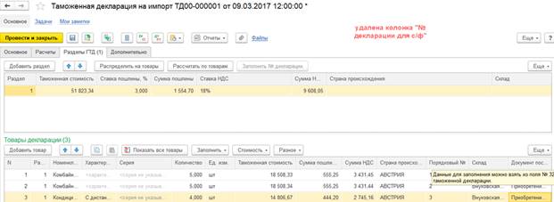 В табличных частях таможенной декларации на закладке Разделы ГТД удалены колонки с номером ГТД № декларации для с/ф.