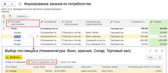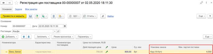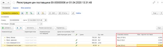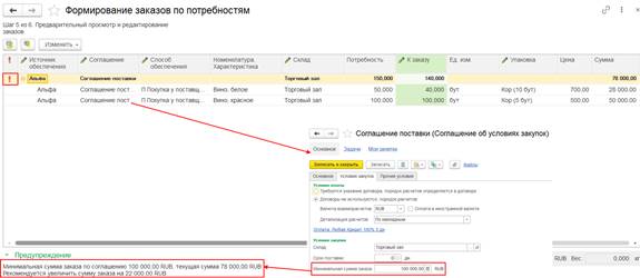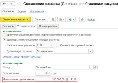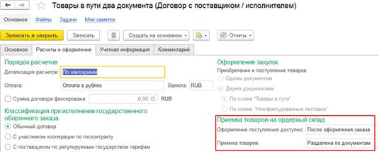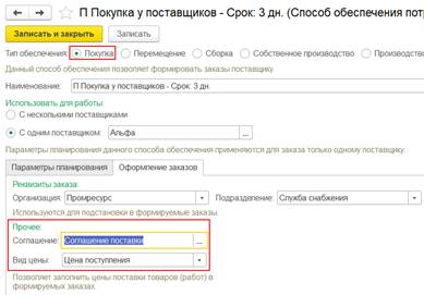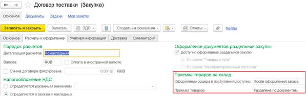 Если с поставщиком зарегистрирован договор на оформление закупок одним документом, то для оформления раздельной закупки двумя документами требовалась регистрация нового отдельного договора с поставщиком. Поскольку в рамках одного договора можно было оформлять либо закупки одним документом, либо закупки двумя документами. Такая возможность обеспечивалась за счет настройки Оформление закупок в договоре с поставщиком.