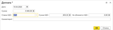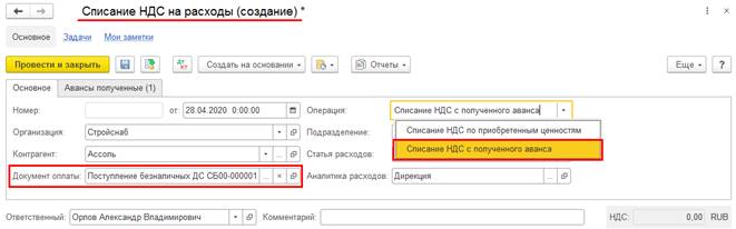 Документ Списание НДС на расходы может быть создан в одноименном рабочем месте, доступном из рабочего места Помощник по учету НДС, или вводом на основании документа Счет-фактура выданный (аванс). При вводе документа Списание НДС на расходы на основании документа Счет-фактура выданный (аванс) поле Документ оплаты и табличная часть Авансы полученные заполняются автоматически по данным счета-фактуры на аванс.