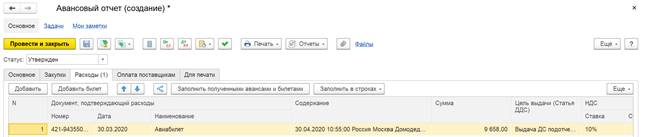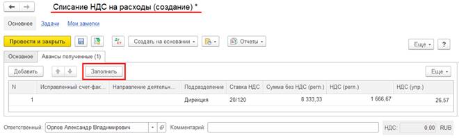 Табличная часть Авансы полученные документа Списание НДС на расходы заполняется по кнопке Заполнить данными об остатках НДС с аванса по выбранному документу оплаты в регистре НДС с авансов полученных.