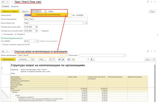 С целью обеспечения возможностей контроля и анализа структуры затрат на выполнение этапов (тем) работ по созданию нематериальных активов, а также структуры формирования стоимости внеоборотных активов, в прикладное решение добавлен отчет Структура затрат на капитализацию. Доступ к отчету обеспечен из контекстного меню в списках и в карточках элементов списков Темы, этапы исследований и разработок, Объекты строительства, Основные средства, Нематериальные активы и расходы на НИОКР.