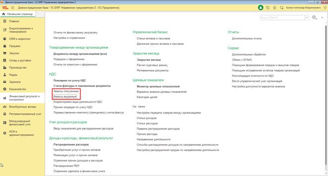 Доступ к рабочим местам НДС с полученных авансов и НДС с выданных авансов организован в меню Финансовый результат и контроллинг - НДС.