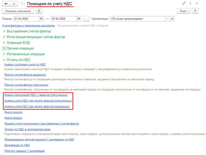 Доступ к отчетам по НДС с авансов организован из рабочего места Помощник по учету НДС, а также в разделе Отчеты по финансовому результату (меню Финансовый результат и контроллинг).