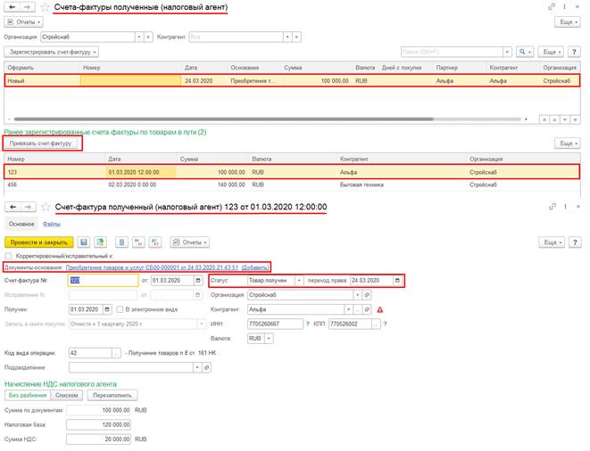 По кнопке Привязать счет-фактуру можно связать документ Счет-фактура полученный (налоговый агент), имеющий статус В пути, с выбранным документом приобретения. При этом в документе Счет-фактура полученный (налоговый агент) документ приобретения будет автоматически указан в качестве основания, статус изменен на Товар получен, в поле переход права будет заполнена входящая дата документа приобретения.
