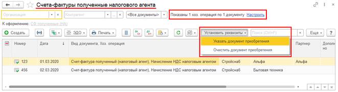 Поддержана возможность привязать/отвязать документ приобретения от документа Счет-фактура полученный (налоговый агент) в рабочем месте Документы НДС. Для этого необходимо по гиперссылке Настроить установить отображение в указанном рабочем месте только документов Счет-фактура полученный (налоговый агент) и по кнопке Установить реквизиты, выбрав соответствующий пункт контекстного меню, указать или очистить документ приобретения в документе Счет-фактура полученный (налоговый агент).