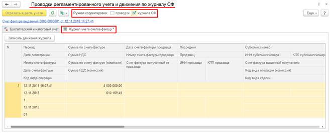При снятии признака ручной корректировки журнала учета счетов-фактур в документе формируются движения в регистр сведений Журнал учета счетов-фактур, соответствующие автоматическому проведению документа.