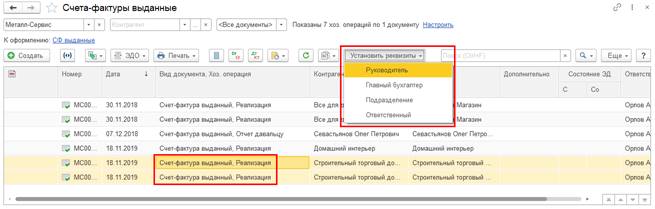 С помощью контекстного меню кнопки Установить реквизиты в рабочем месте Документы НДС (все) также поддержана возможность: