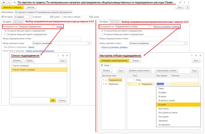 С целью повышения гибкости настроек распределения производственных расходов в прикладном решении переработана и дополнена функциональность установки отборов, используемых при настройке распределения постатейных производственных расходов. В карточках элементов списка Правила распределения и показатели и в документах Распределение расходов теперь отборы можно настроить на подразделение (направление распределения) и базу распределения по партиям не только выбором списка необходимых значений, но и наложением условий с использованием стандартных видов сравнения (Равно/Не равно, В группе/Не в группе, Заполнено/Не заполнено и пр.) Условия отбора могут быть наложены как непосредственно на значения поля, так и на его реквизиты.