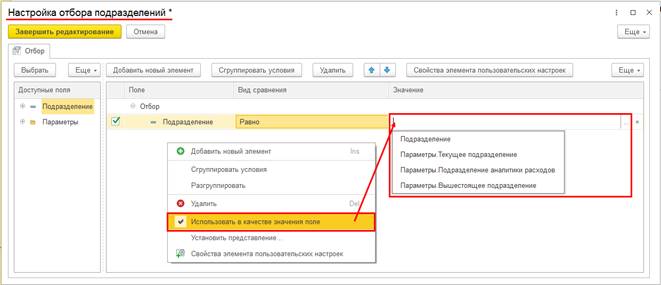Поддержана возможность использовать при отборе в качестве значения подразделения предопределенные параметры. Путем нажатия правой кнопки мыши на строке условия и выбора в контекстном меню пункта Использовать в качестве значения поле можно выбрать в качестве значения отбора следующие параметры: