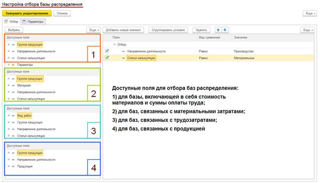 Доступность полей, по которым могут быть установлены отборы баз распределения, зависит от того, какой показатель выбран в качестве базы распределения расходов между партиями.