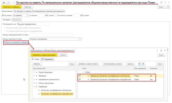 При использовании организацией метода оценки стоимости товаров ФИФО обеспечена возможность исключения полуфабрикатов из баз распределения производственных расходов, связанных с материальными затратами (когда распределение расходов Между партиями по базе выполняется по следующим показателям: Стоимость материалов и сумма оплаты труда, Стоимость материалов, Количество материалов, Вес материалов, Объем материалов). Для этого в настройки правил распределения расходов добавлены отборы Исключать полуфабрикаты собственные и Исключать полуфабрикаты переработчика.