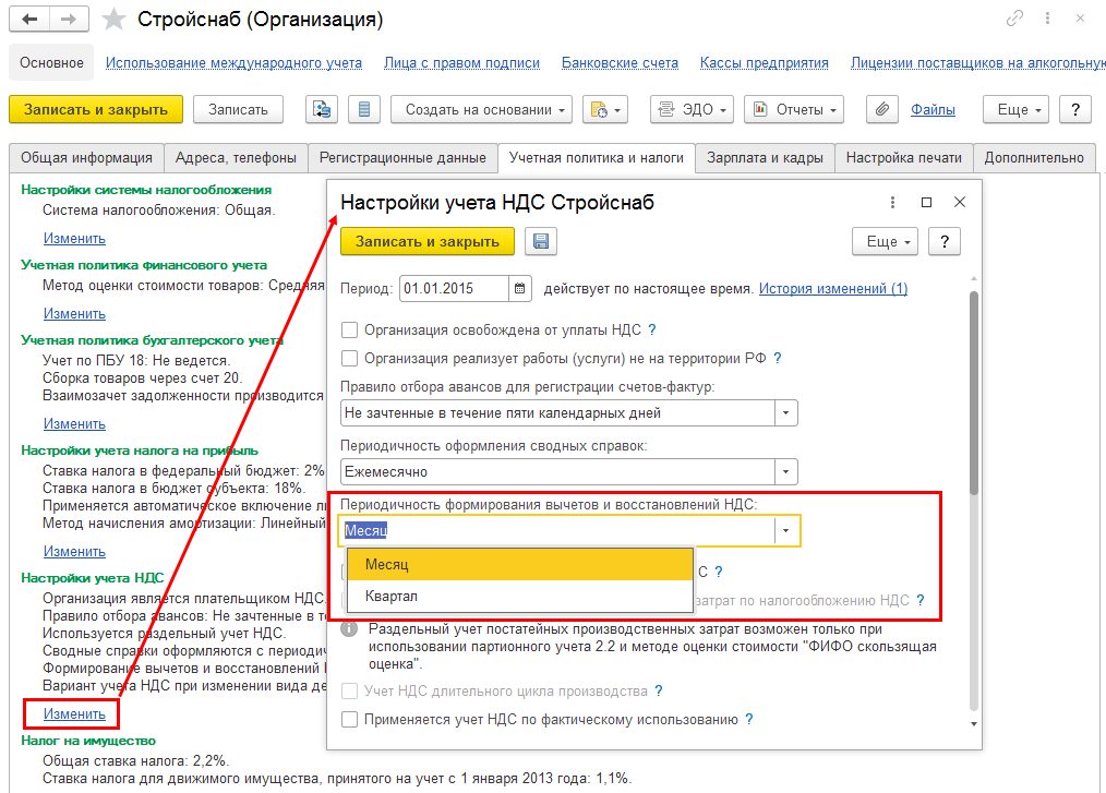 При обновлении информационной базы в имеющихся учетных политиках организаций настройка Периодичность формирования вычетов и восстановлений НДС будет установлена в значение Ежемесячно.