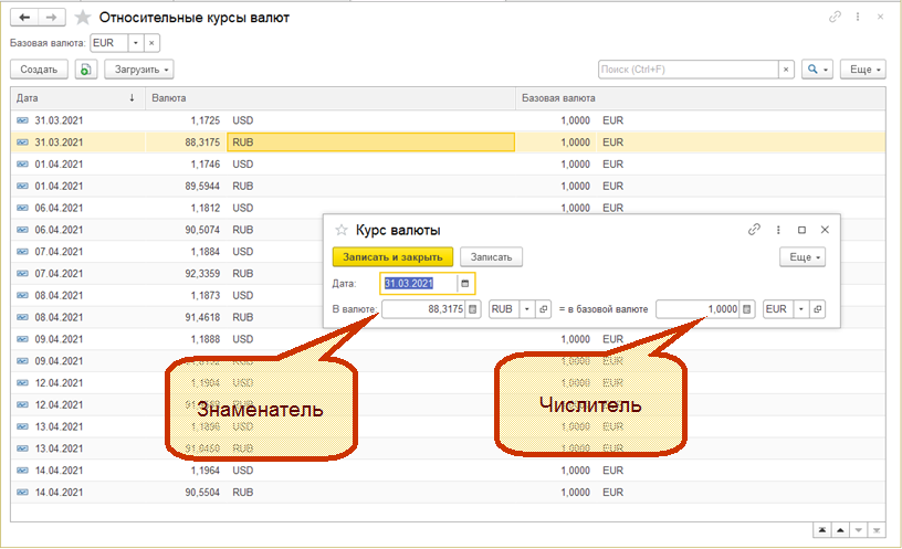 При указании курса для алгоритмов системы количество единиц базовой валюты определяется как Числитель, а количество единиц иностранной валюты – как Знаменатель.