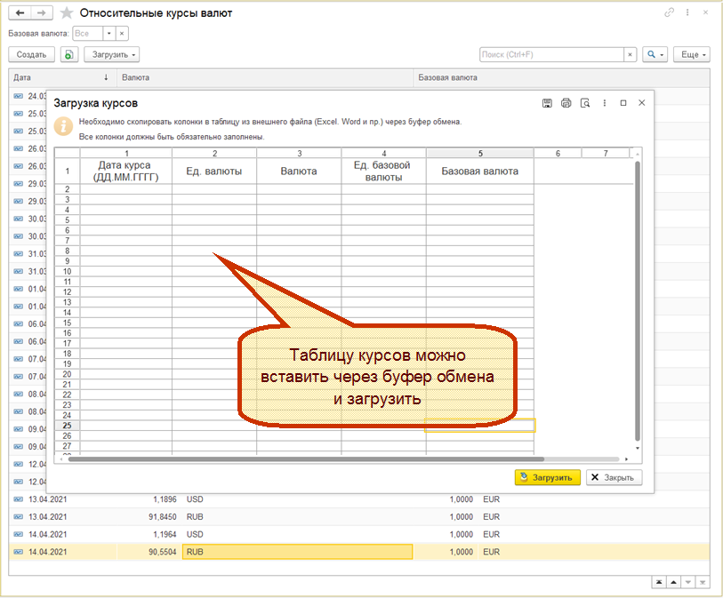 По кнопке Загрузить – Курсы валют из таблицы в регистре сведений Относительные курсы валют реализована возможность загрузки курсов валют из внешней таблицы.