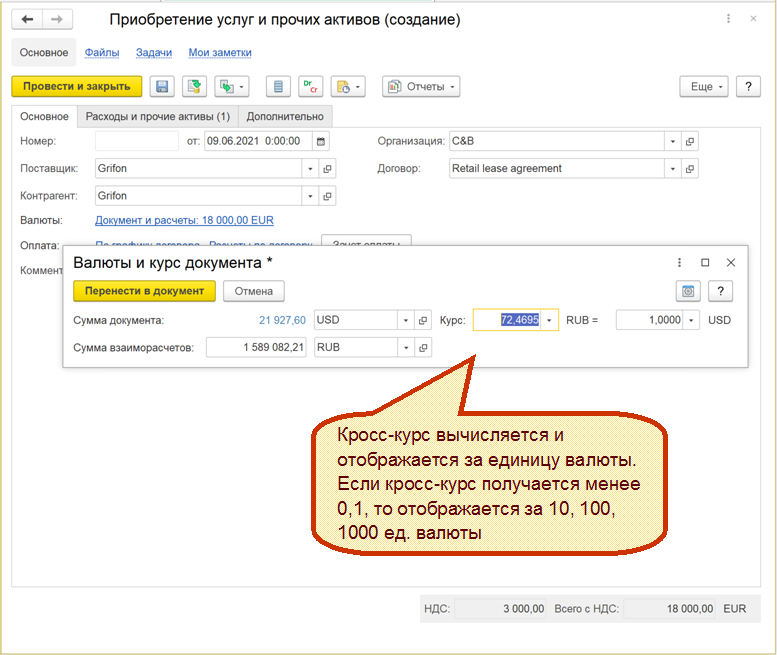 При настройке курсов валют в документах обеспечивается работа, как с числителем курса, так и со знаменателем.