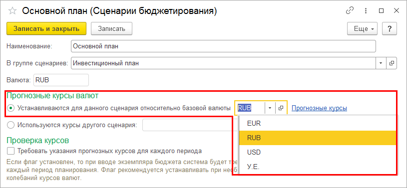 Внесены изменения в настройку сценариев бюджетирования. В карточку элемента списка Сценарии бюджетирования к значению Устанавливаются для данного сценария переключателя Прогнозные курсы валют добавлен выбор базовой валюты, относительно которой устанавливаются курсы.