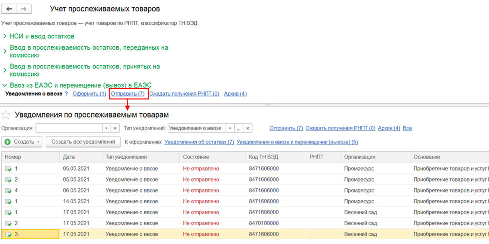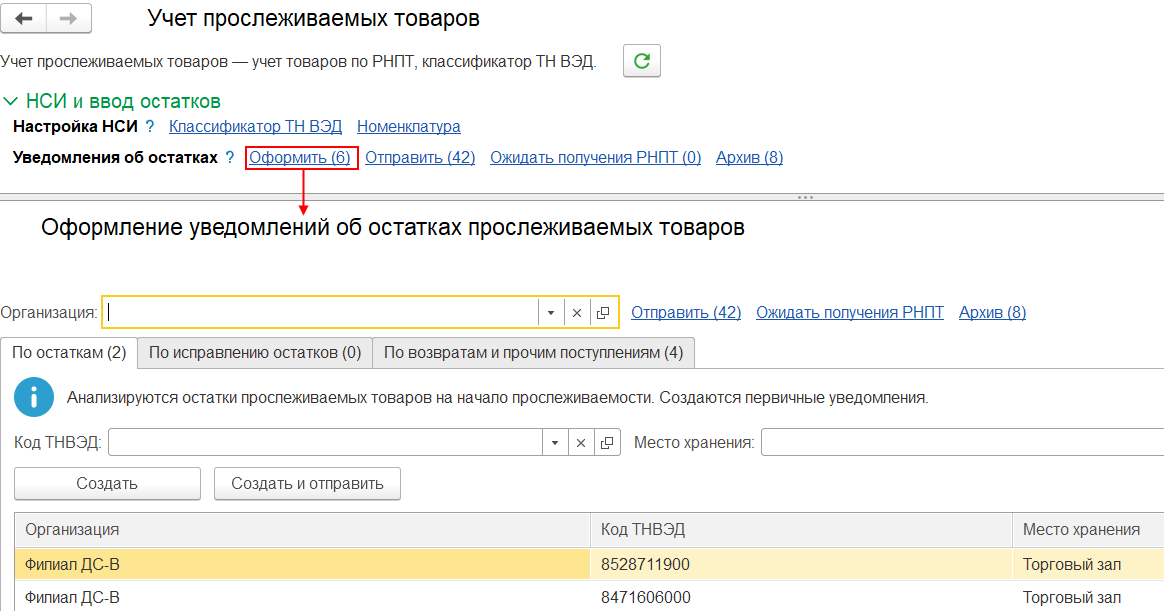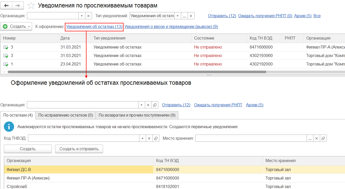 Список оформленных уведомлений об остатках прослеживаемых товаров, которые требуется отправить в ФНС, и по которым необходимо получить РНПТ, отображается в журнале документов Уведомления по прослеживаемым товарам (гиперссылка Отправить).