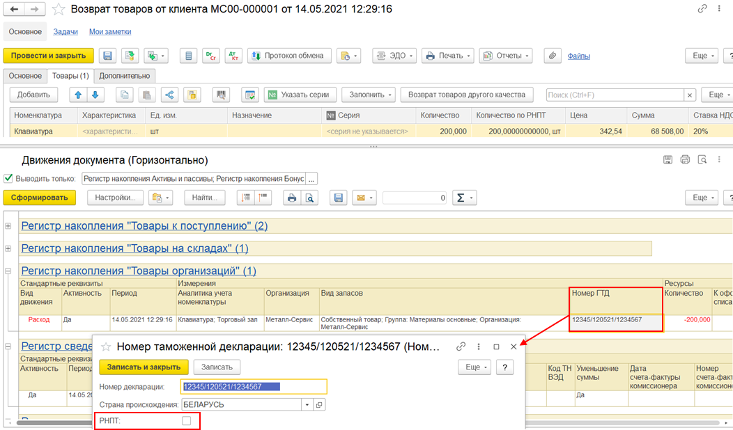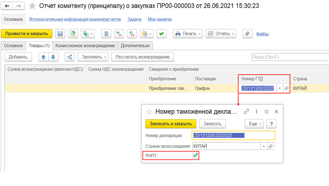 В справочнике Номера ГТД предусмотрен реквизит РНПТ, который означает, что элемент справочника является номером РНПТ.