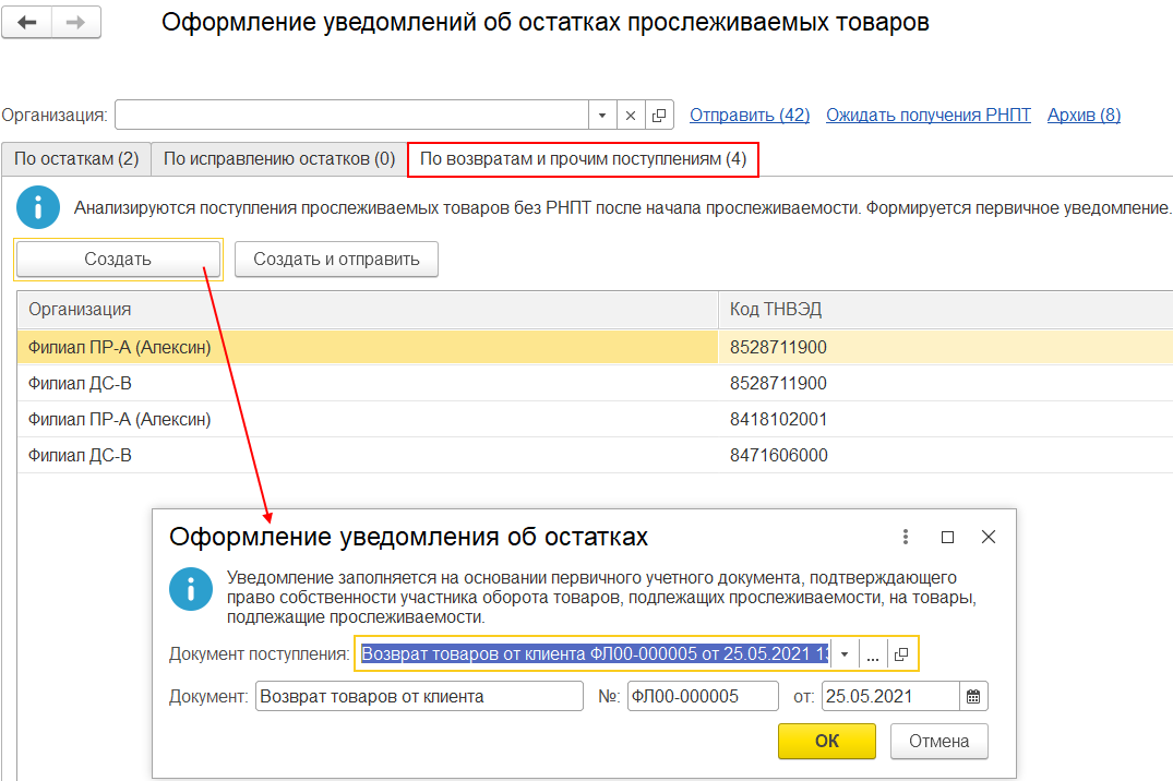 На закладке По возвратам и прочим поступлениям формируются данные в разрезе организаций и кода ТН ВЭД на основании документов, сформированных после даты начала ведения учета прослеживаемости. Предусмотрено формирование первичного уведомления.