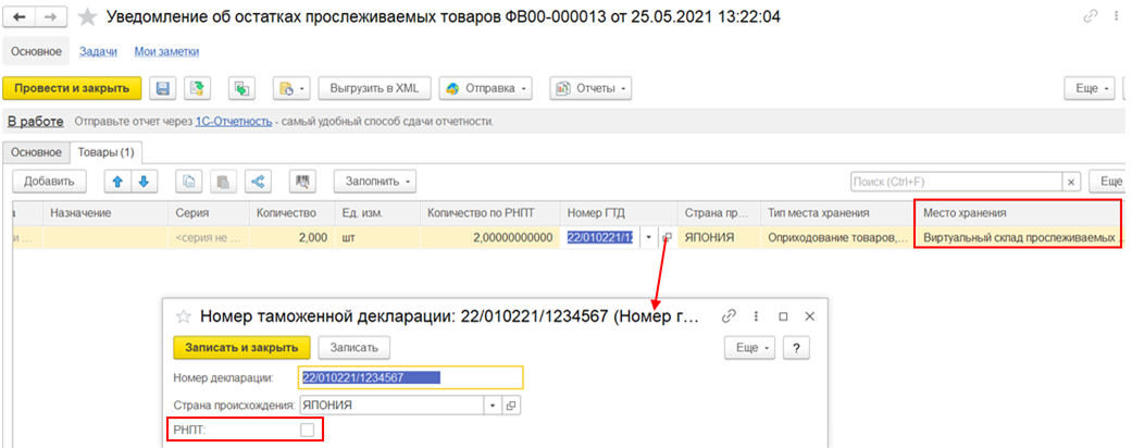 Документом уведомления об остатках прослеживаемых товаров списываются остатки с номером ГТД без признака РНПТ и приходуются остатки с номером ГТД с признаком РНПТ.