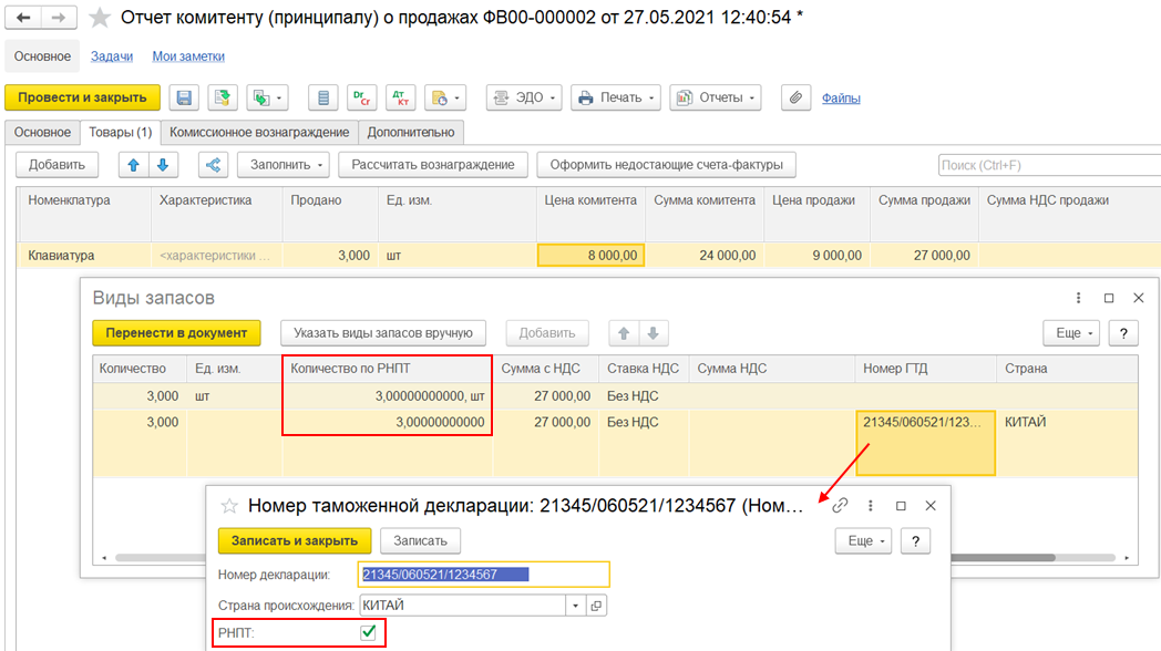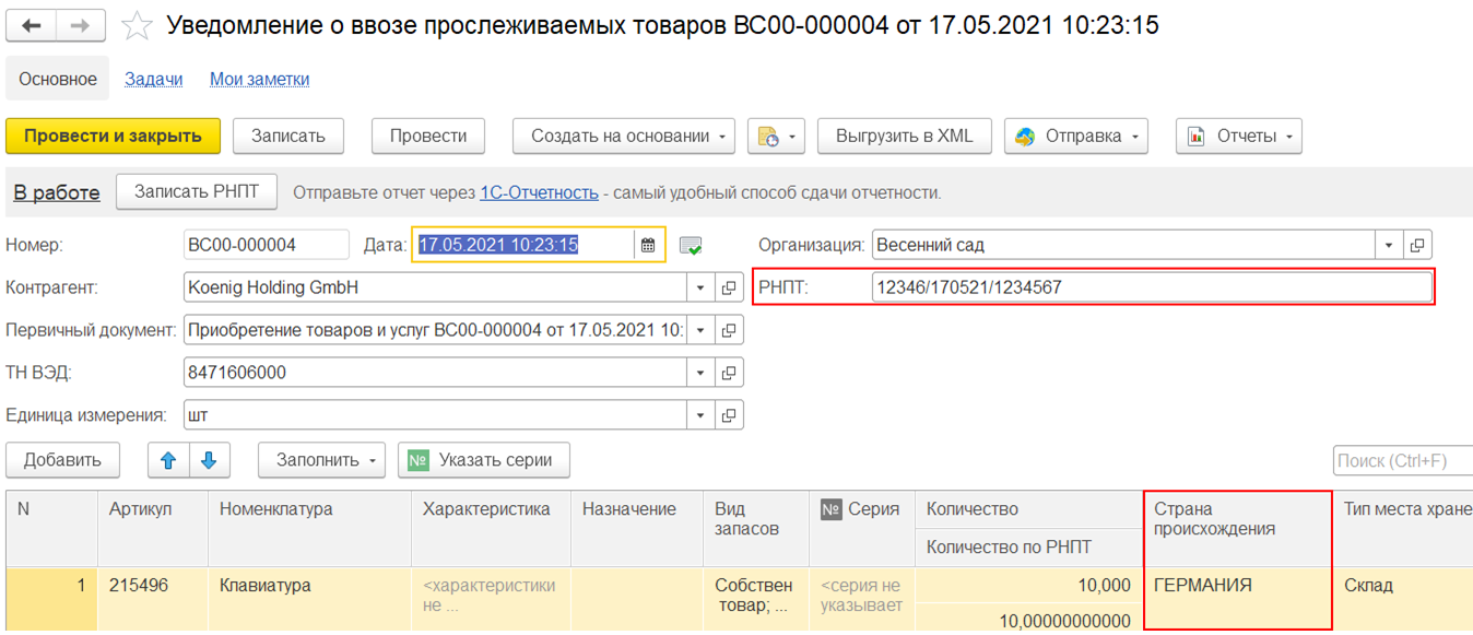 При учете прослеживаемых импортных товаров в двух единицах измерения в документах доступно поле Количество по РНПТ, количество в котором заполняется в единице измерения прослеживаемости ТН ВЭД.