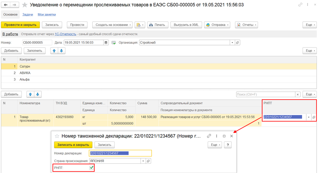 Если товарам, подлежащим прослеживаемости, присвоен регистрационный номер партии товара, то в форме элемента Номер таможенной декларации установлен признак РНПТ.