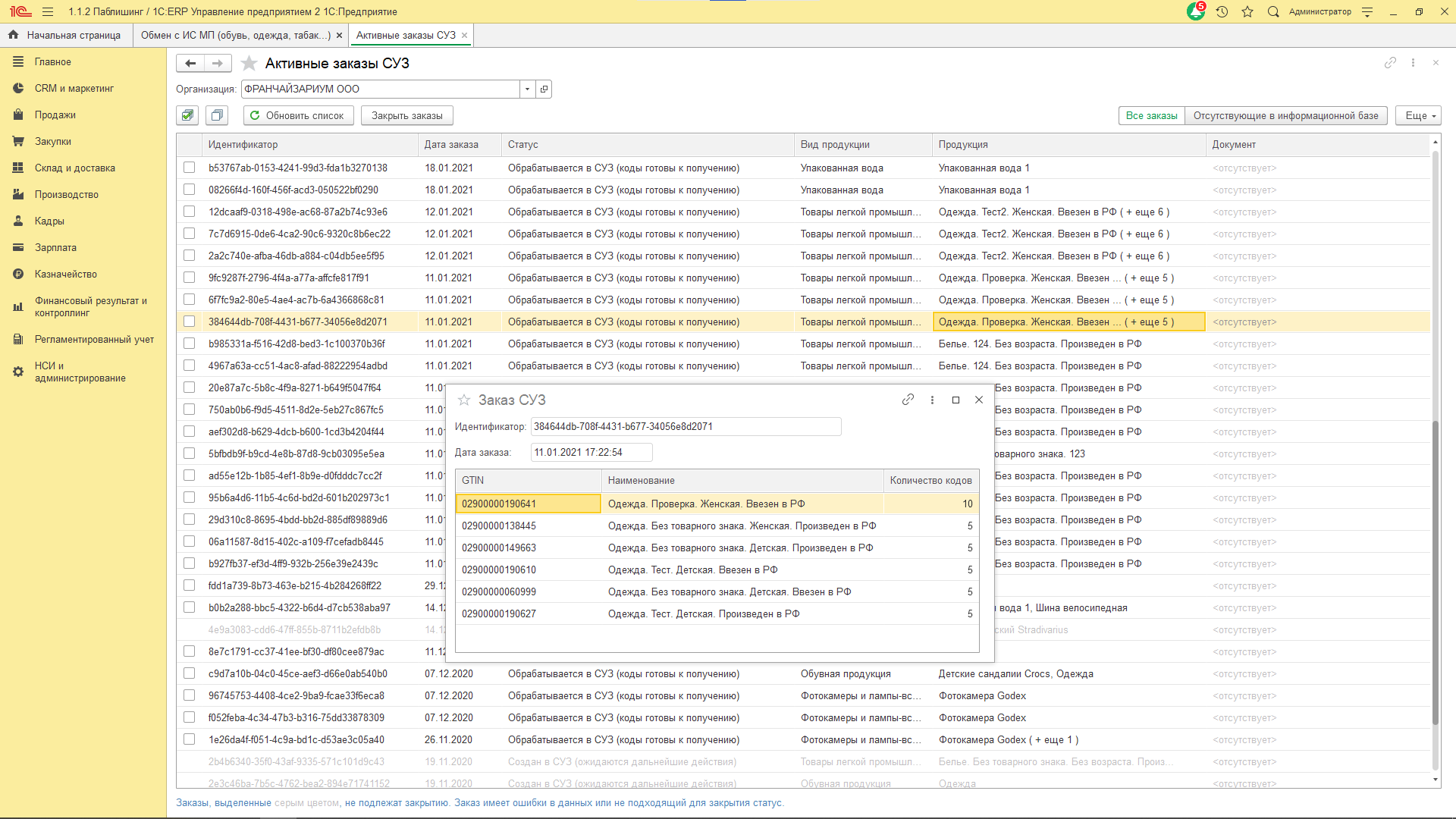 Данные для формирования уведомлений группируются в разрезе организации, РНПТ, гиперссылки на первичное уведомление, текущего количества по РНПТ по данным регистра «Товары организаций» и количества по РНПТ (ранее указано), по которому отчитались в ФНС.