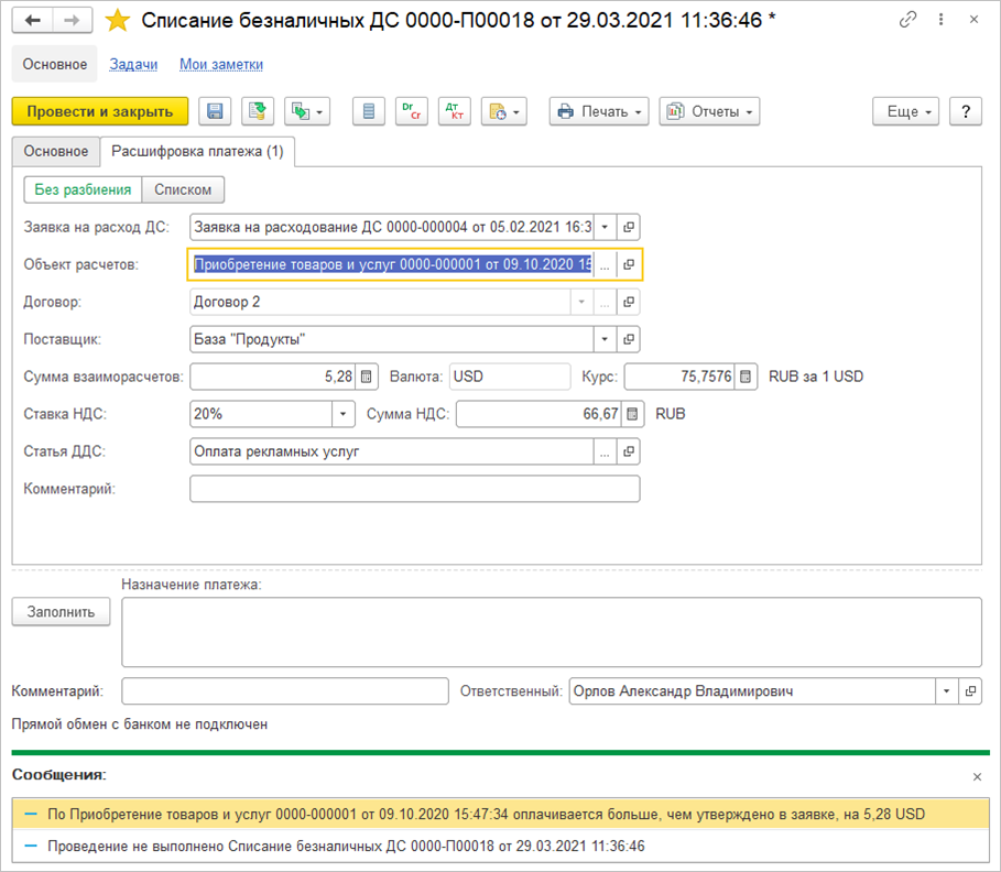 Списание безналичных денежных средств |