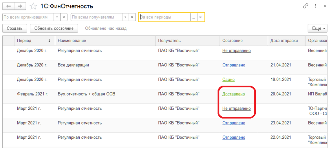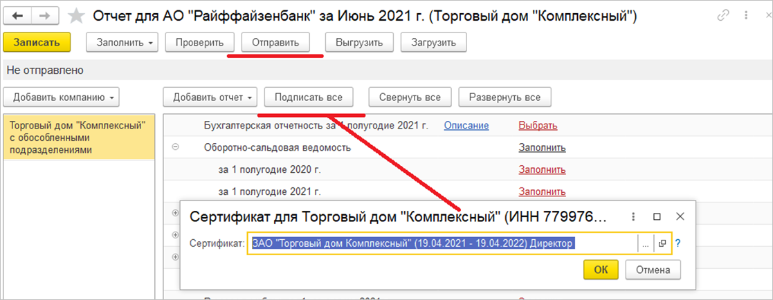 Уведомление может быть отправлено в контролирующие органы сразу после создания через 1С:Отчетность (команда Создать и отправить).