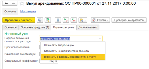 В документе Выкуп арендованных ОС необходимо указать стоимость в налоговом учете.