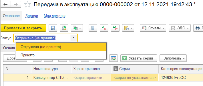 В случаях, когда серия присваивается ТМЦ при передаче в эксплуатацию (учет серий на складах для данного вида номенклатуры отключен, а для ТМЦ в эксплуатации – включен), для указания серии после отгрузки ТМЦ со склада можно использовать статус Отгружено (не принято) документа Передача ТМЦ в эксплуатацию (при данной комбинации серия не указывается).