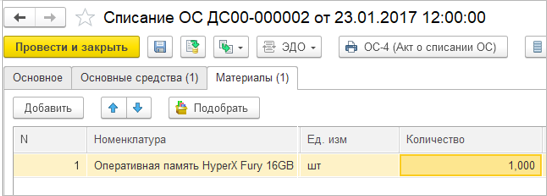 Уменьшить стоимость групповых ОС или списать их после выбытия ТМЦ можно в рабочем месте Списание ОС при выбытии ТМЦ. Стоимость уменьшается с помощью документа Списание ОС. Выбытие ТМЦ и списание ОС должны быть сформированы в одном месяце.