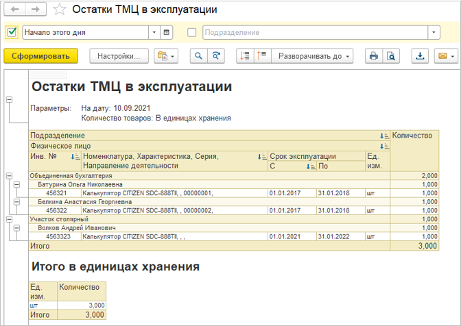 Если имущественный учет отключен, то ТМЦ в количественном выражении списываются при передаче в эксплуатацию и пользователю не требуется вести дальнейший учет (перемещение, списание, возврат).