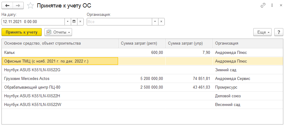 Групповое ОС необходимо принять к учету до конца месяца, в котором ТМЦ переданы в эксплуатацию, с помощью документа Принятие к учету ОС. Сделать это можно в рабочем месте Принятие к учету ОС, где показаны непринятые к учету ОС. По умолчанию срок использования определяется сроком эксплуатации ТМЦ. При принятии к учету для разных видов учета можно настроить различный порядок учета. Например, можно принять к учету в бухгалтерском и управленческом учетах, а в налоговом учете стоимость сразу включить в расходы.