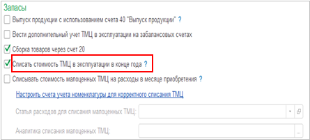 В системе добавлена возможность списать стоимость ТМЦ в эксплуатации в конце нужного года (например, в декабре 2021 г). Для этого нужно создать настройку учетной политики бухгалтерского учета в том году, в котором требуется списать стоимость и установить флаг Списать стоимость ТМЦ в эксплуатации в конце года.