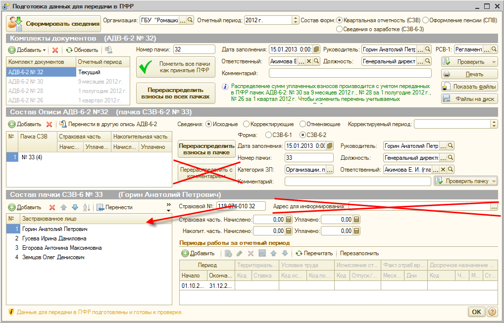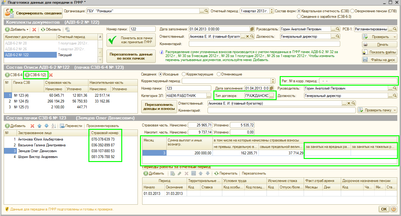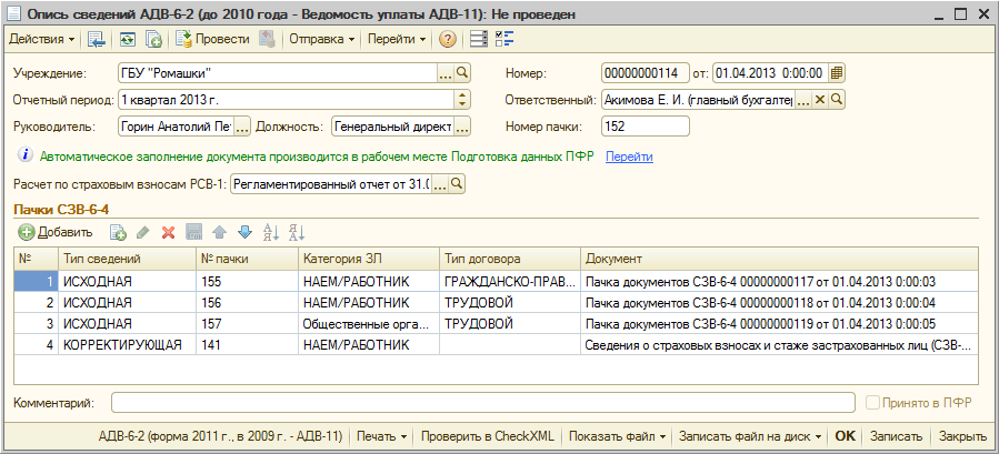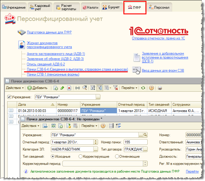 Автоматическое формирование и заполнение документов СЗВ-6-4 и соответствующей описи АДВ-6-2, а также формирование всех печатных форм и файлов предполагается осуществлять из рабочего места подготовки данных для ПФР.