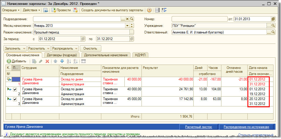 В январе 2013 проводится перерасчет зарплаты в связи с изменением оклада с 20.12.2012 на 45 000 руб.