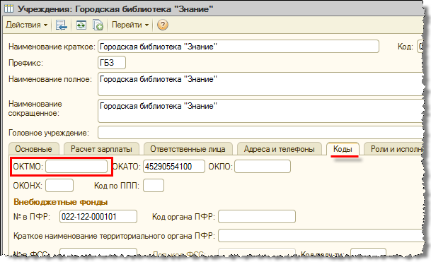Код ОКТМО учреждения теперь можно указать в его карточке на закладке «Коды».