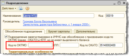 Для территориально обособленных подразделений, зарегистрированных в ИФНС, код ОКТМО также указывается в их карточке. При записи такого подразделения в 2013 году обязательными для заполнения являются оба кода (ОКТМО и ОКАТО), с 2014 года обязательным будет только код ОКТМО.