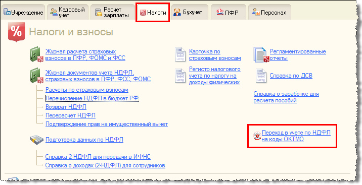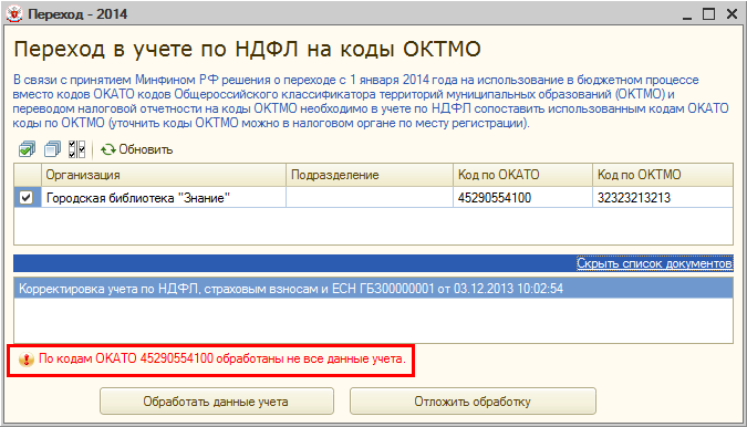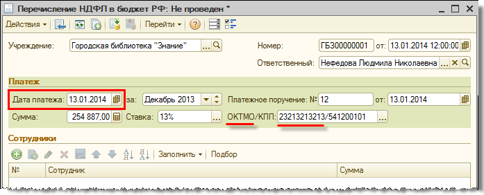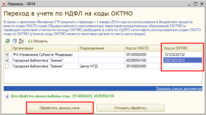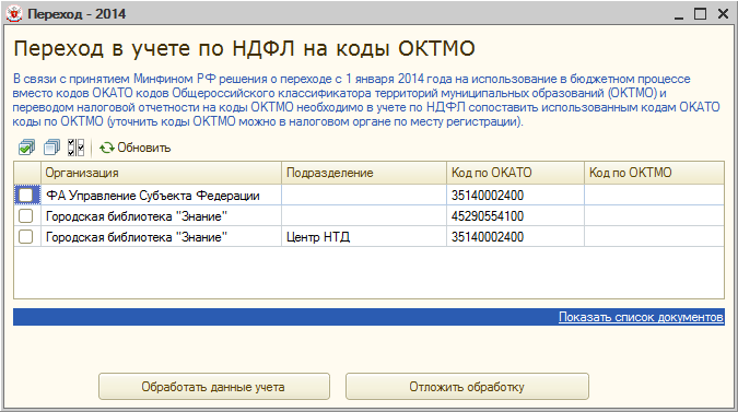 При регистрации документом «Перечисление НДФЛ в бюджет РФ» сумм уплаченного в 2014 году налога потребуется выбрать код ОКТМО, а не ОКАТО (среди указанных в карточке учреждения или обособленных подразделений).