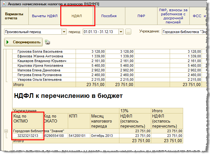 При регистрации уплаты НДФЛ в оставшиеся дни 2013 года в документе по-прежнему указывается код ОКАТО, однако для формирования отчетности за 2013 год необходимо, чтобы для учреждения и обособленных подразделений уже в 2013 году были указаны коды ОКТМО.