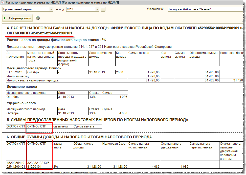 Вывод кодов ОКТМО реализован также и в отчете «Регистр налогового учета по НДФЛ». В отчете за 2013 год отображается как коды ОКАТО, так и ОКТМО, начинания с 2014 года – только ОКТМО.