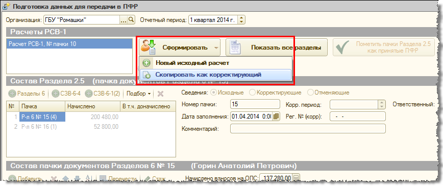 Возможность появляется, когда работа с исходным отчетом завершена, т.е. он был отмечен из рабочего места как принятый ПФР (нажата кнопка «Пометить пачки Раздела 2.5 как принятые ПФР»). В этом случае в меню кнопки «Сформировать» становится доступен пункт «Скопировать как корректирующий».